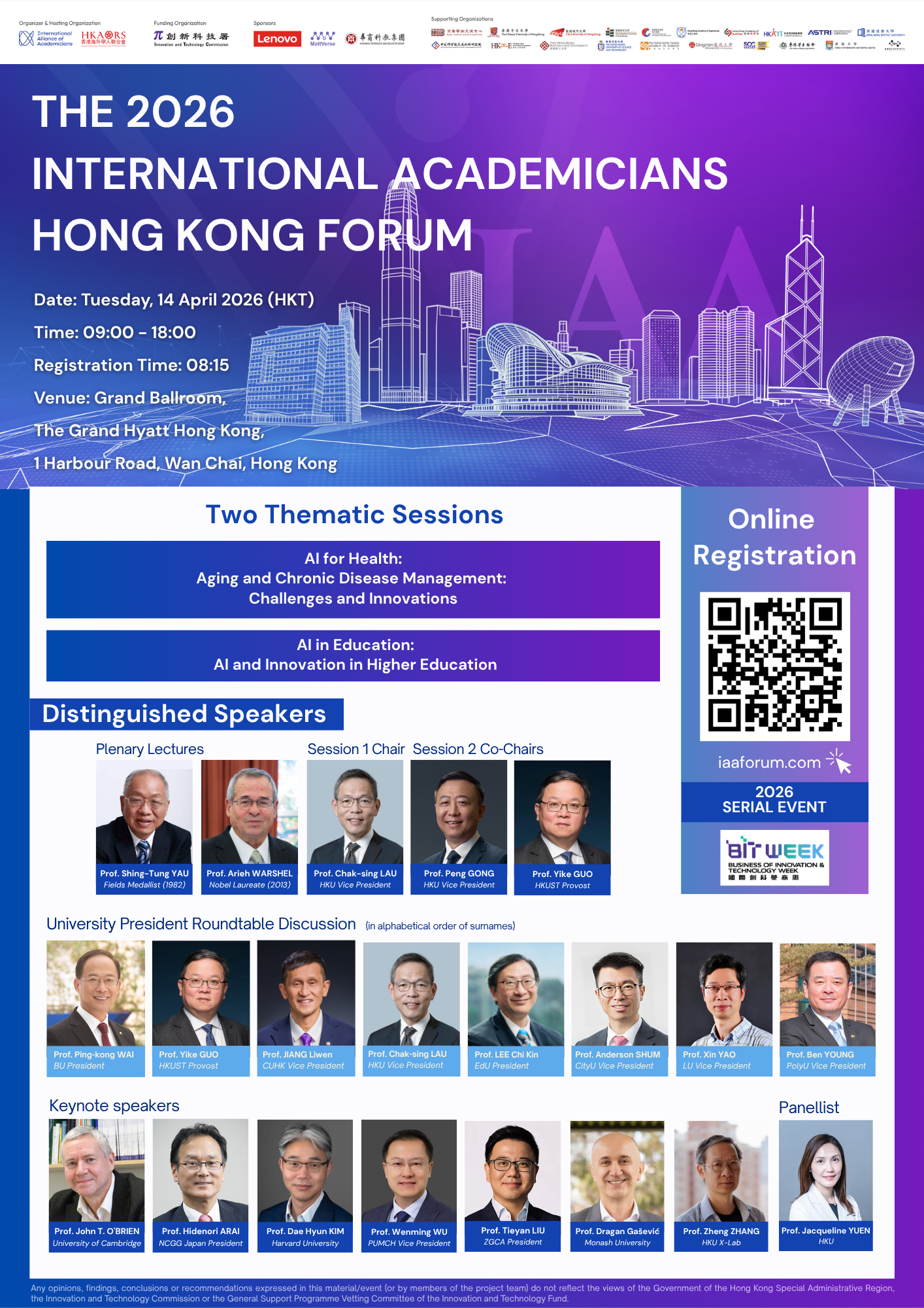 We are pleased to announce that the 2026 International Academicians Hong Kong Forum will be held on 14 April 2026 as a serial event of the 2026 Business of Innovation and Technology Week (BIT Week). This year’s event will focus on two themes of profound societal relevance: AI for Ageing and AI in Education, exploring how artificial intelligence can transform healthcare, enhance learning, and shape a more sustainable future. Join us in Hong Kong for a day of insight, dialogue, and collaboration with the world’s leading academic minds.