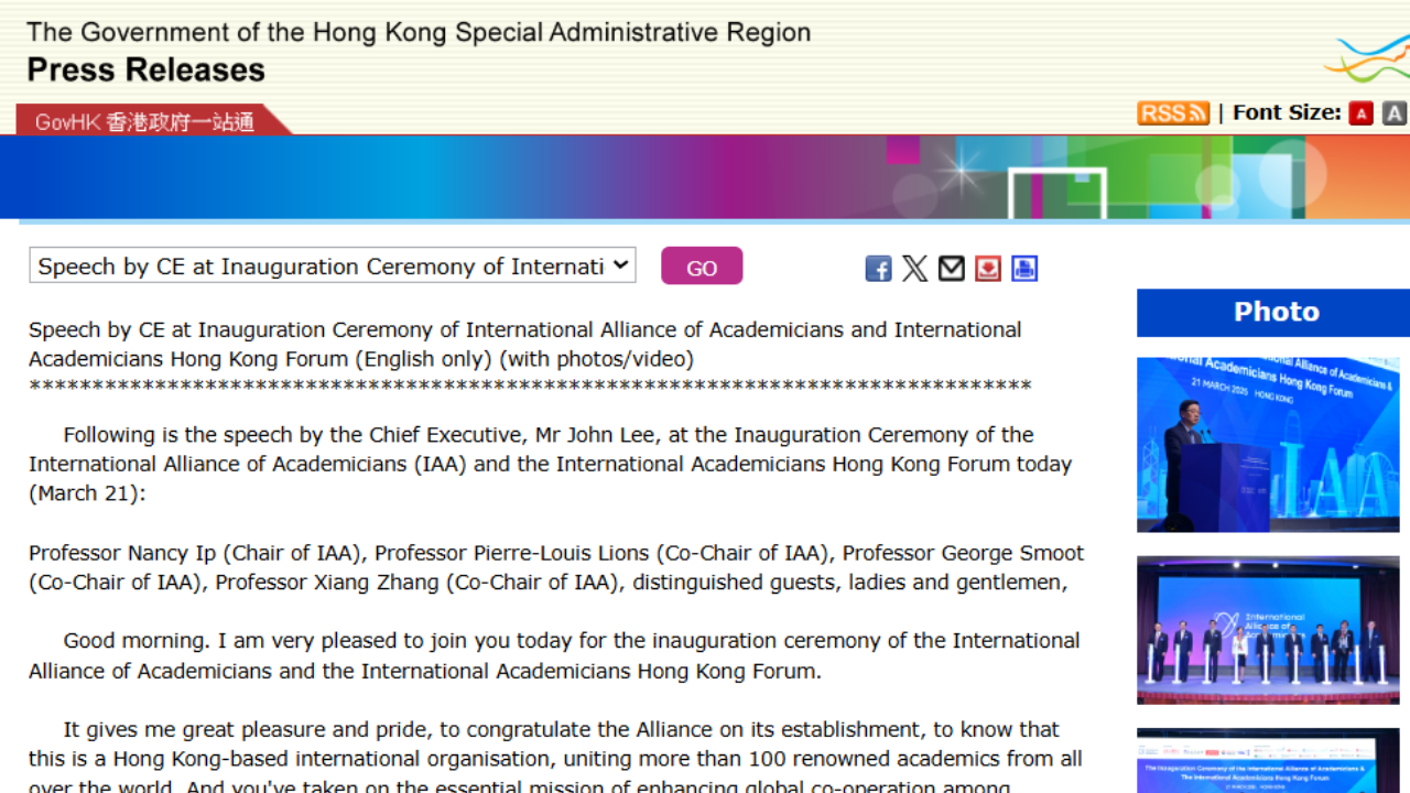 Speech by CE at Inauguration Ceremony of International Alliance of Academicians and International Academicians Hong Kong Forum (English only) (with video)