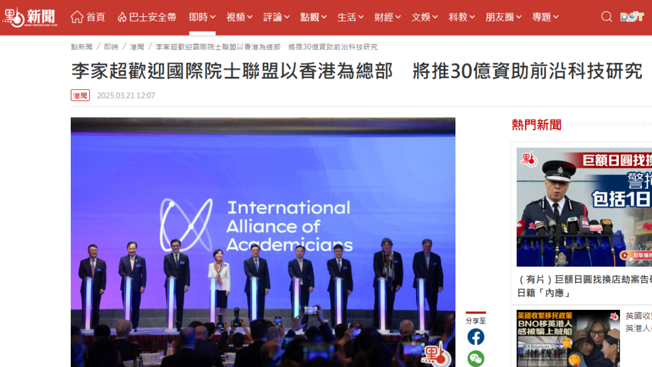 國際院士聯盟成立 李家超歡迎以香港為總部 推30億資助前沿科技研究