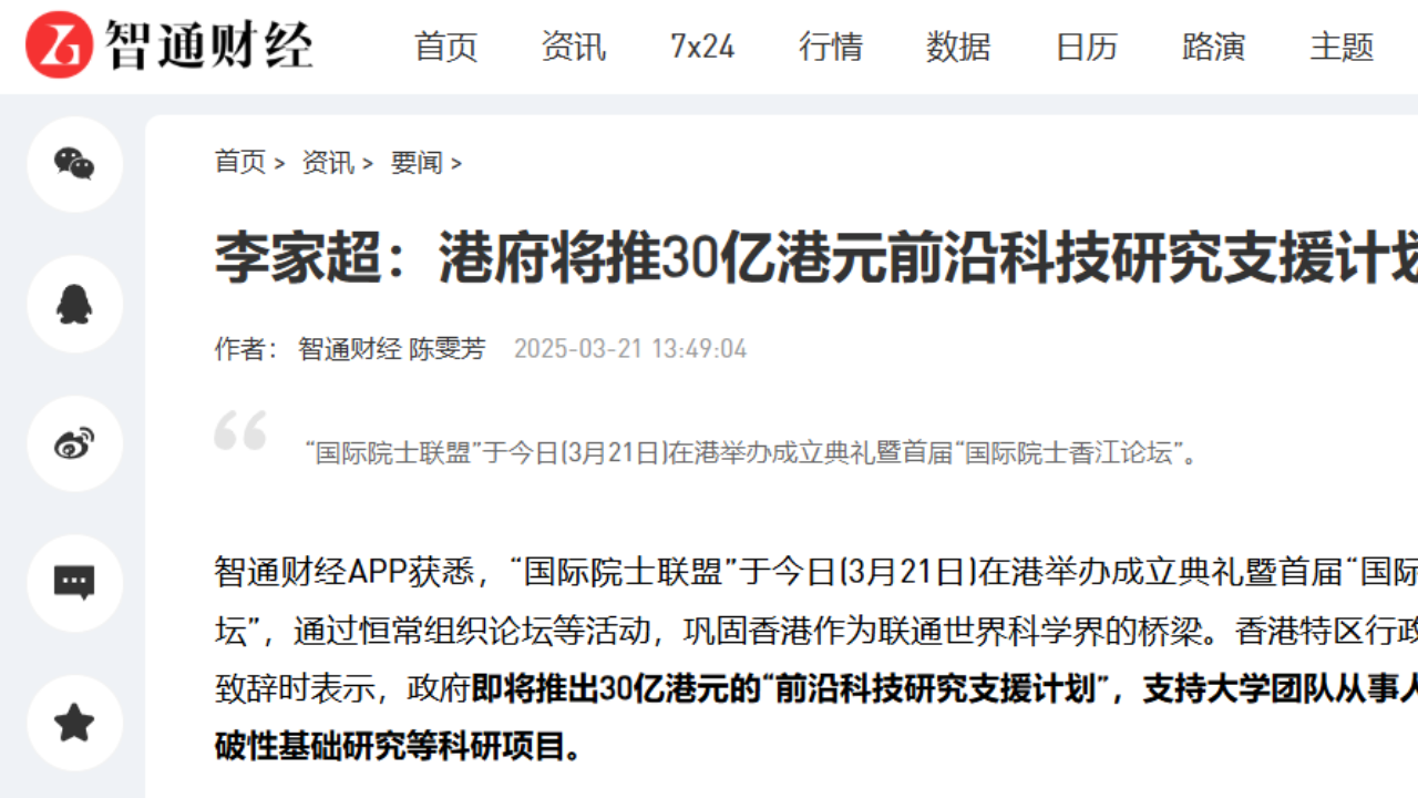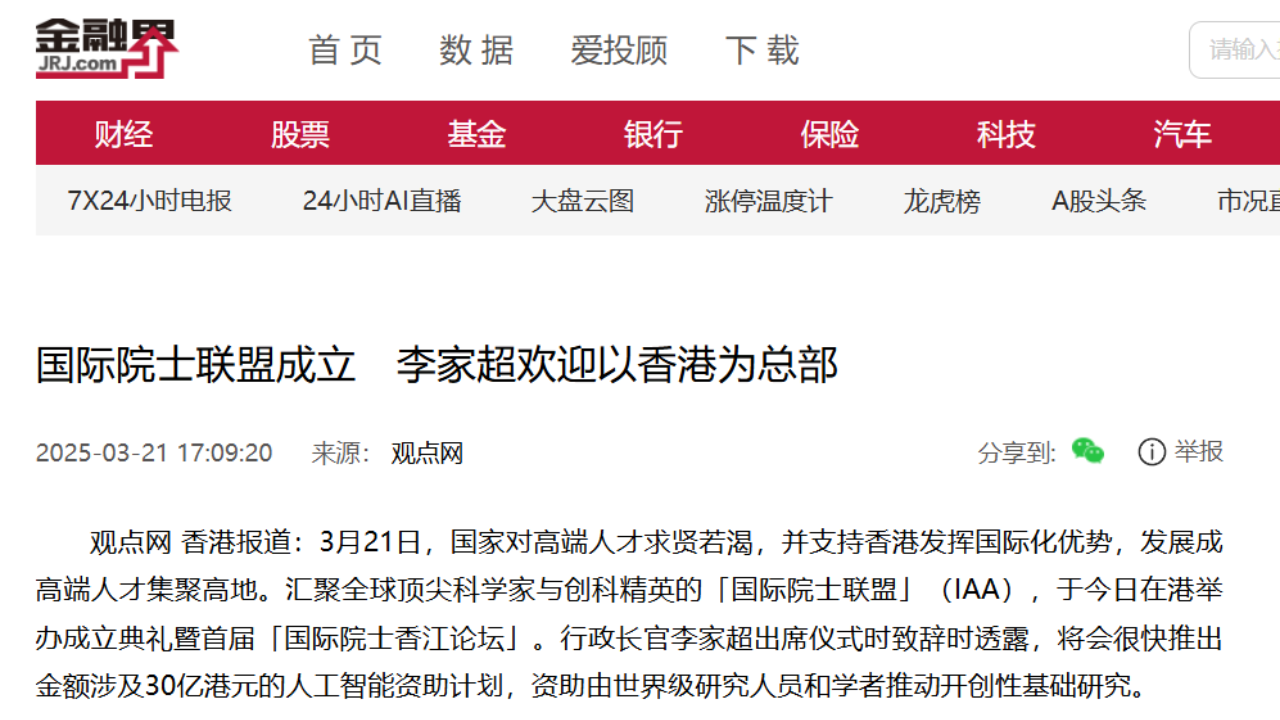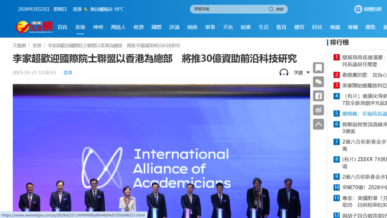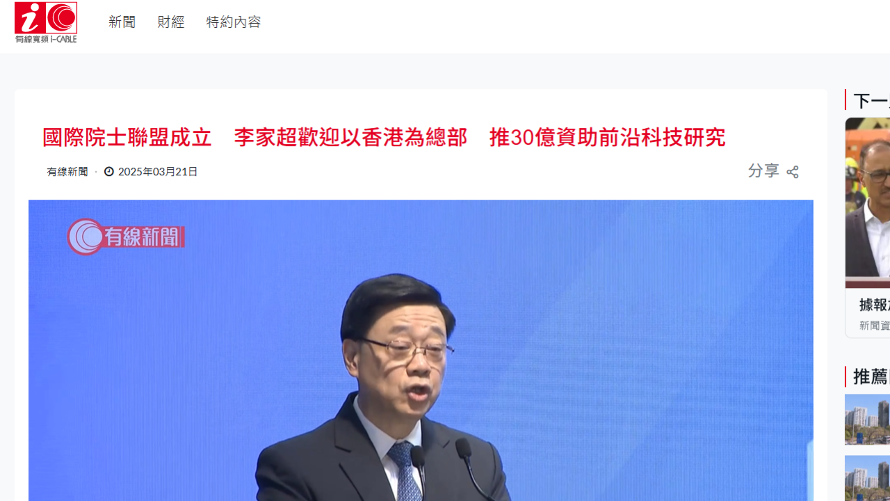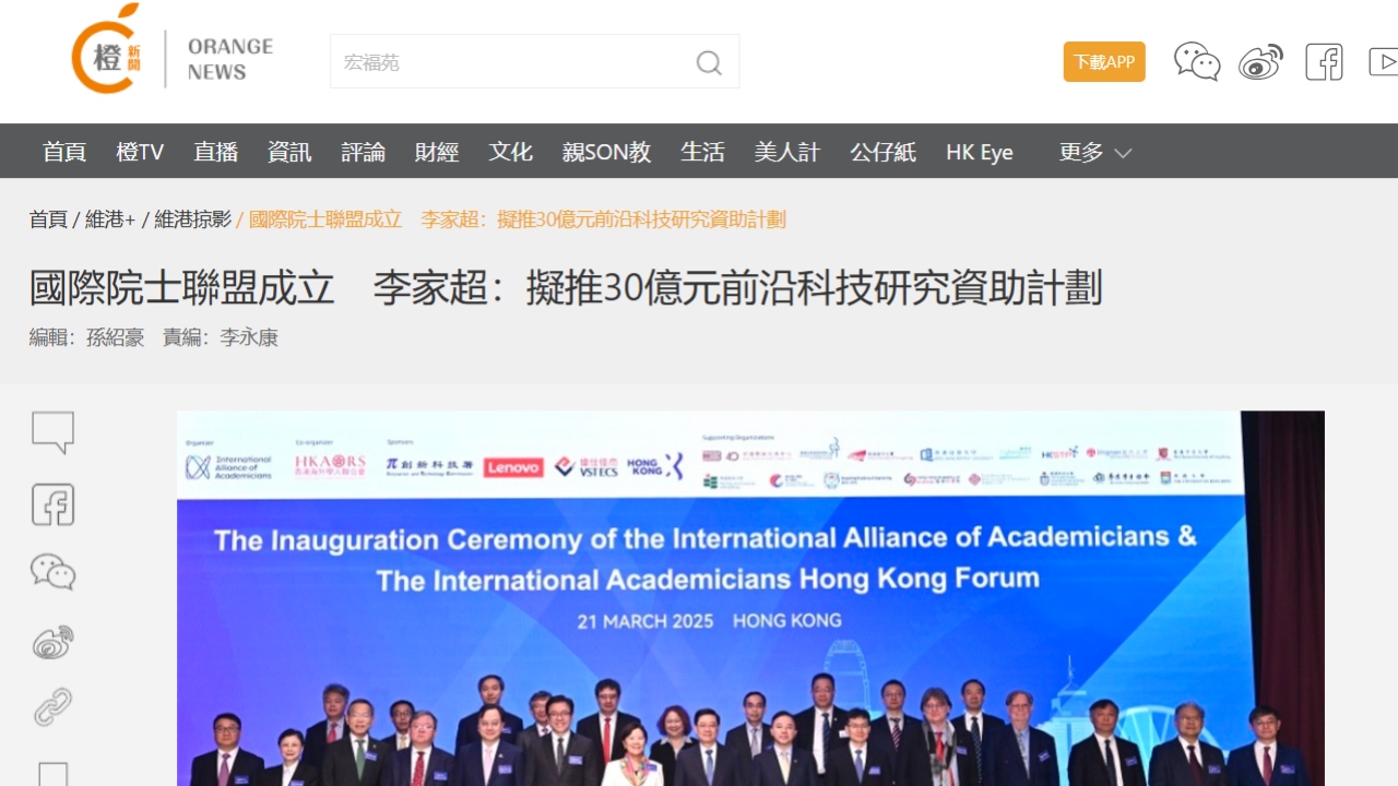 國際院士聯盟成立 李家超:擬推30億元前沿科技研究資助計劃