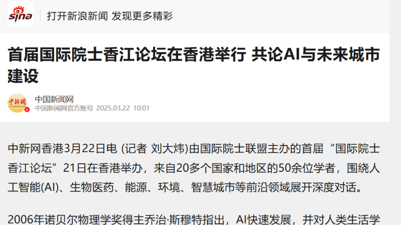 首屆國際院士香江論壇在香港舉行 共論AI與未來城市建設