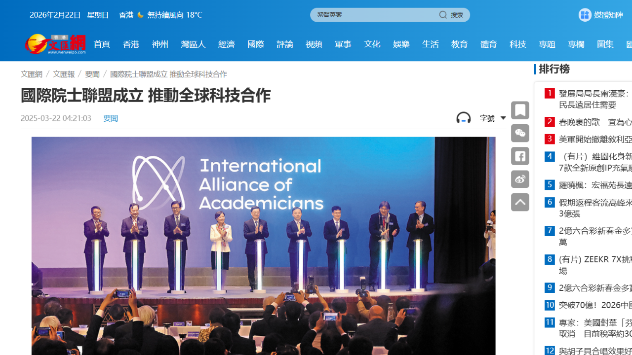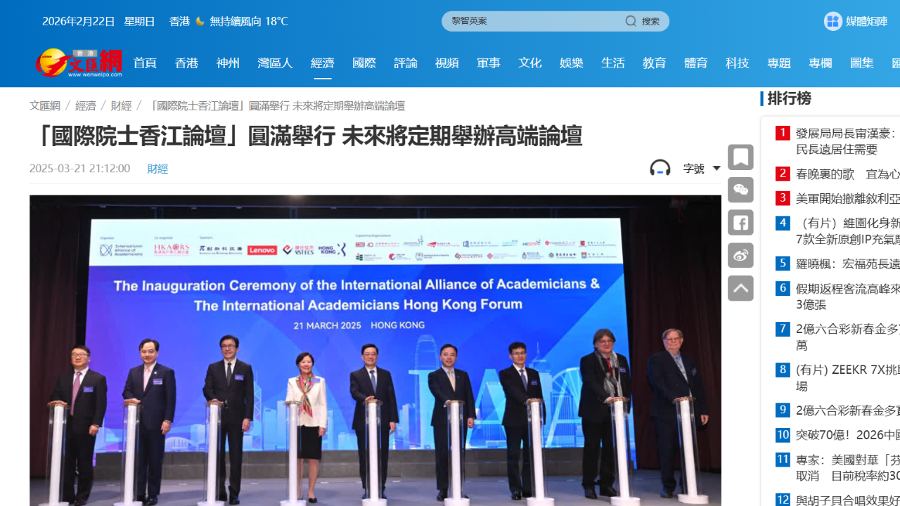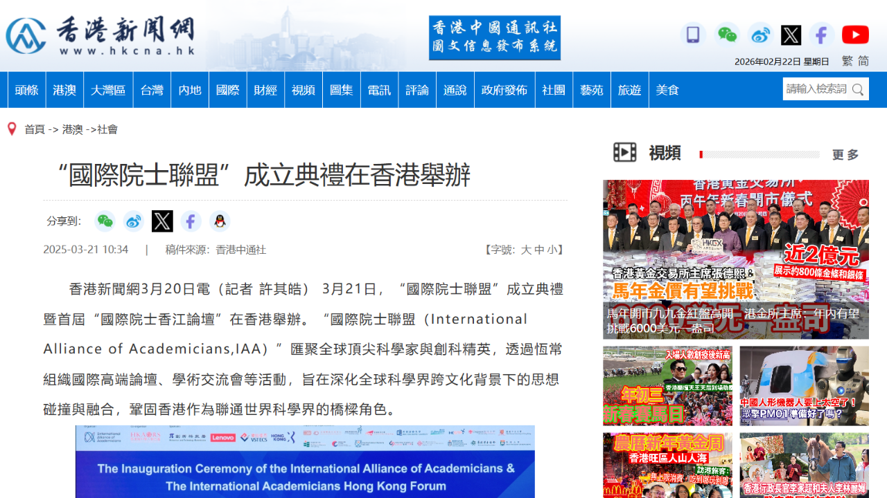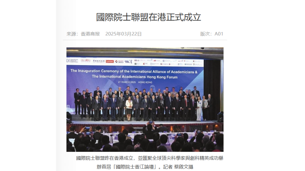 “國際院士聯盟”成立典禮亮相香港